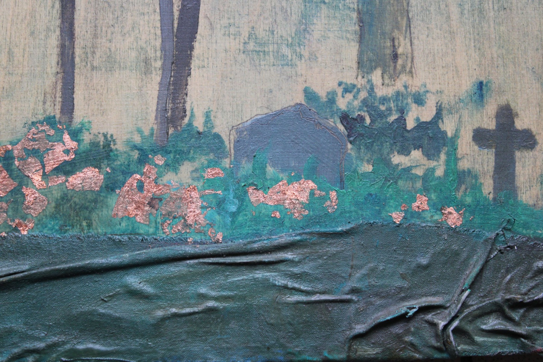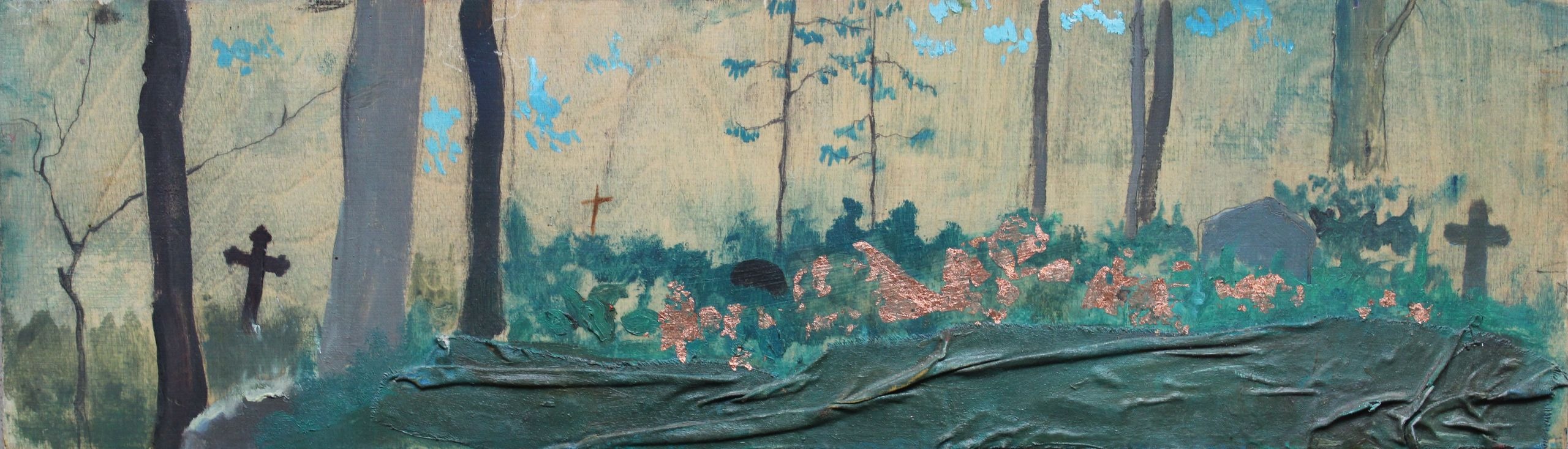 Vecie kapi. 2018. Eļļa uz koka saplākšņa. 16x54,4 cm
