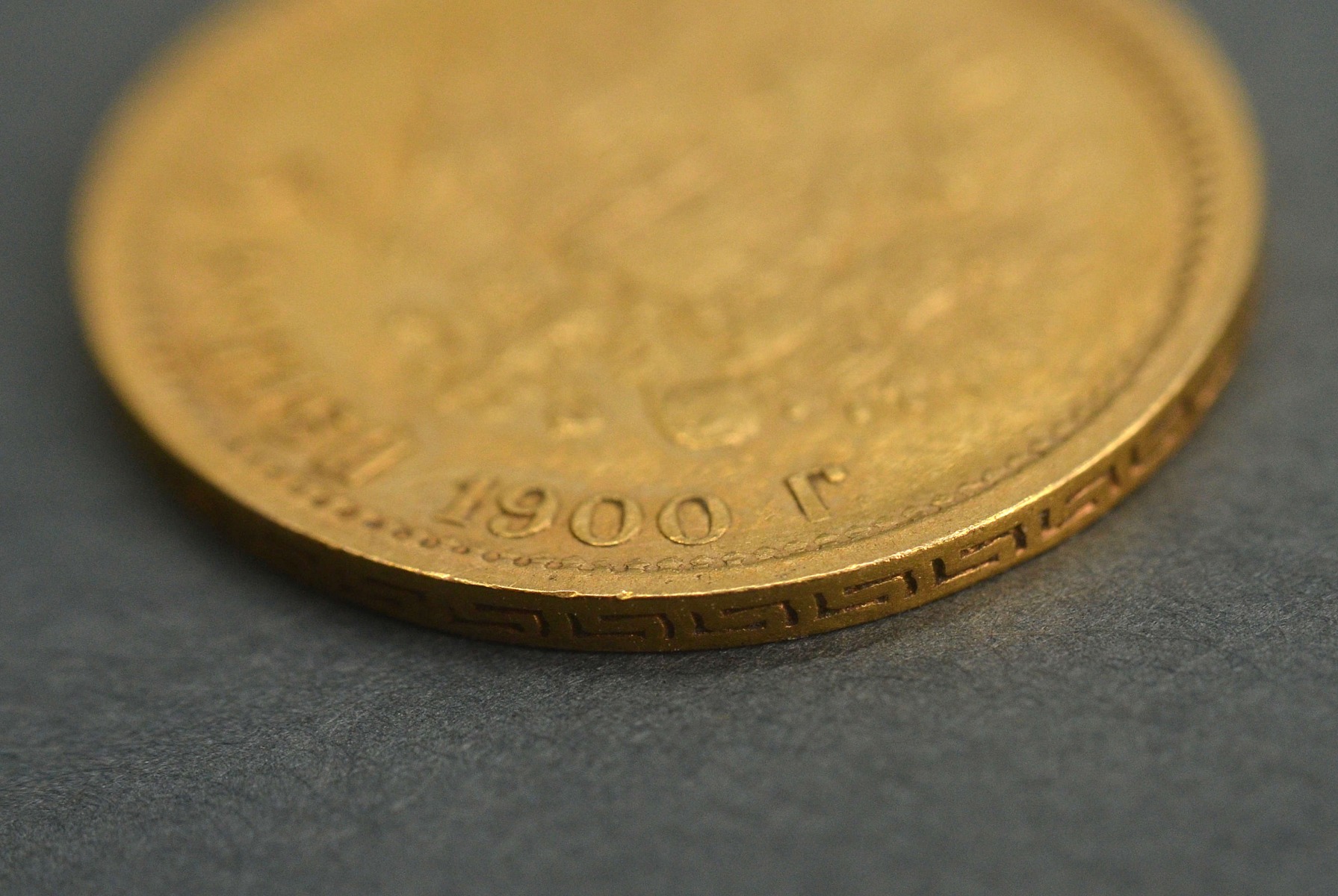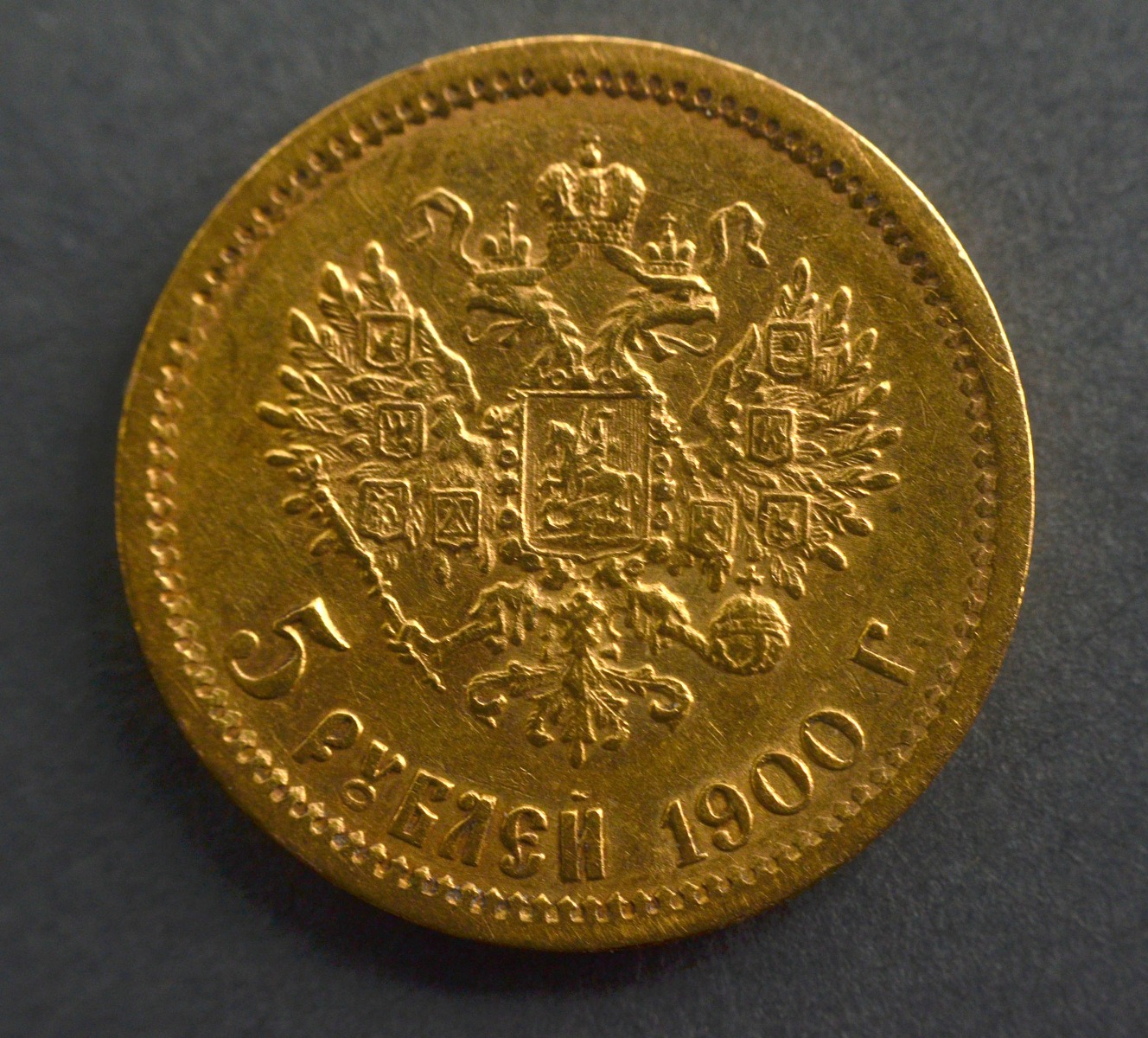 Zelta 5 rubļu monēta. Krievijas impērija 1900 g.