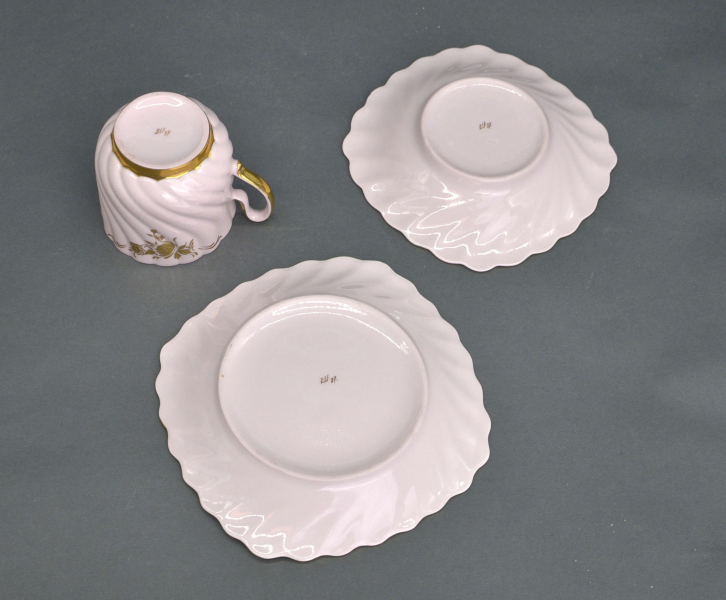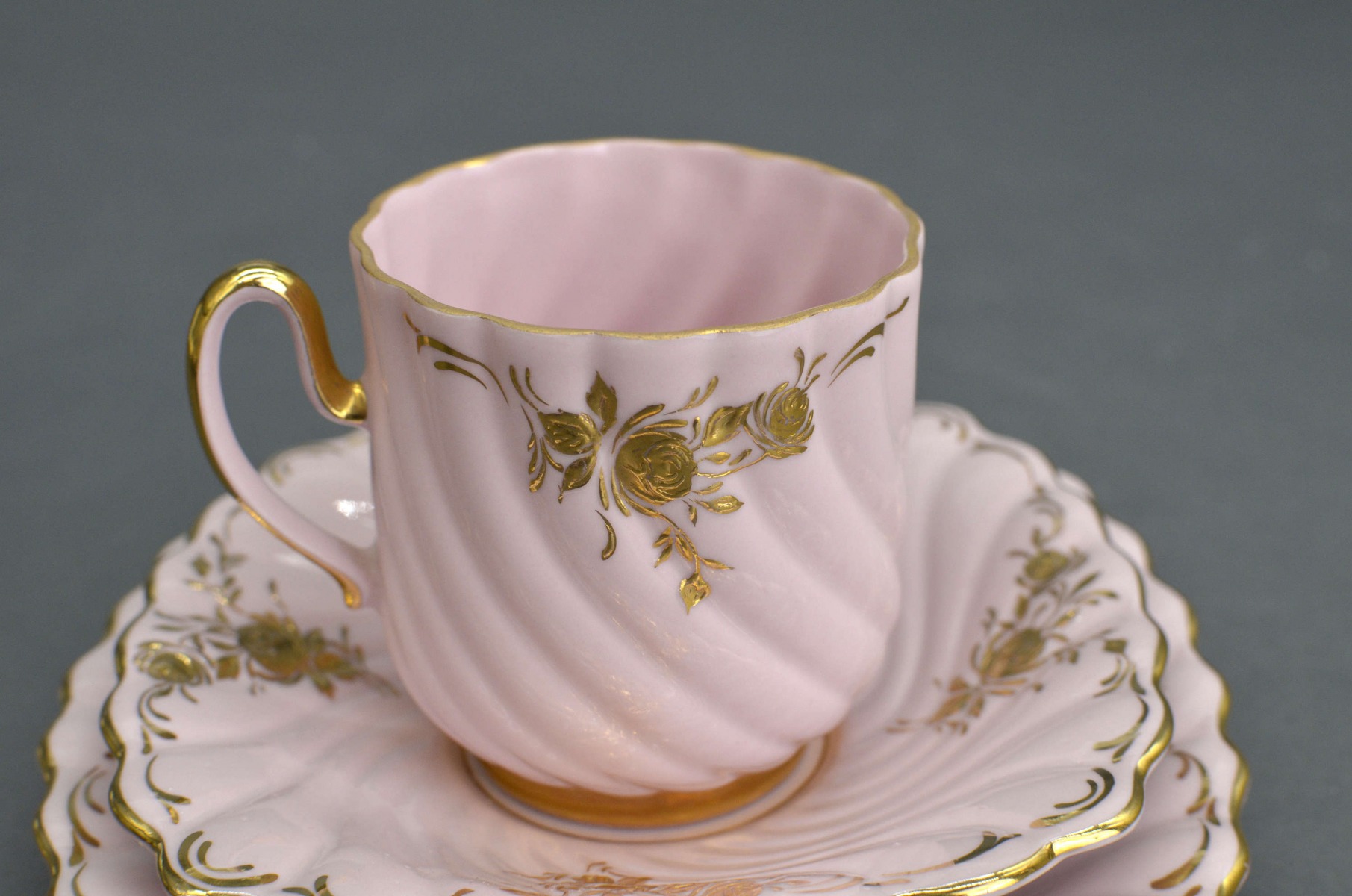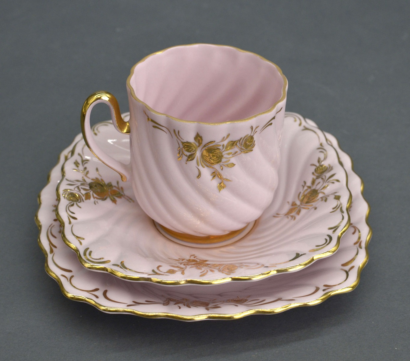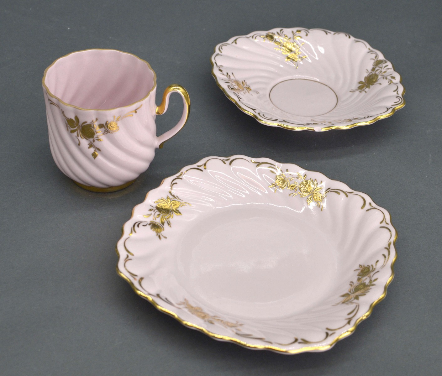 Набор из трех предметов Мокка розовый фарфор. Чашки высотой 7 см. Диаметр 6 см, блюдце 12 см, десертная тарелка 14 см.