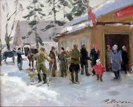 В колхозе зимой 1950, kартон, масло, 28,5х35,5 см 171 / l335 n